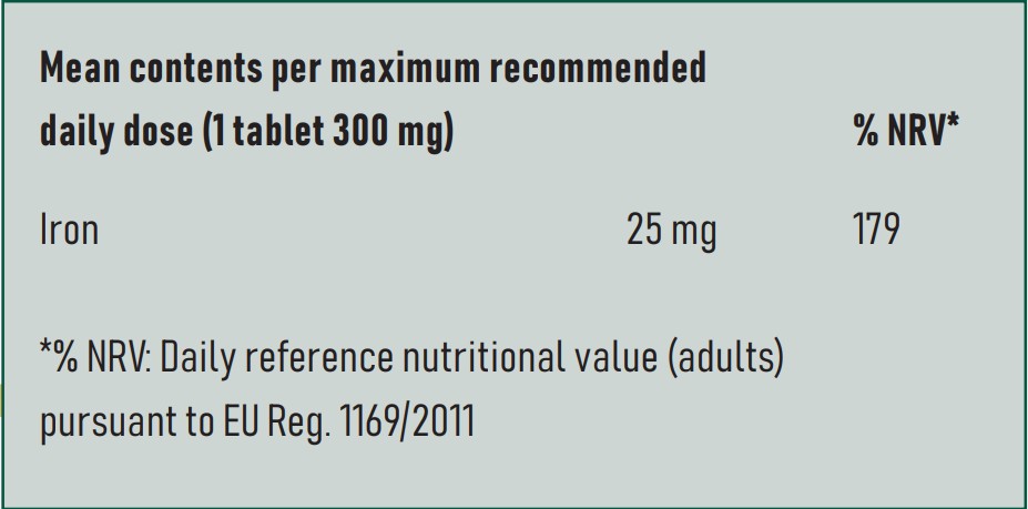 Eisenbisglycinat 20% Albion, Füllstoff: mikrokristalline Cellulose; Beschichtung: HPMC (hydroxypropyl) methylcellulose), Polyethylenglykol; Trennmittel: pflanzliches Magnesiumstearat, Siliciumdioxid anhidrous.