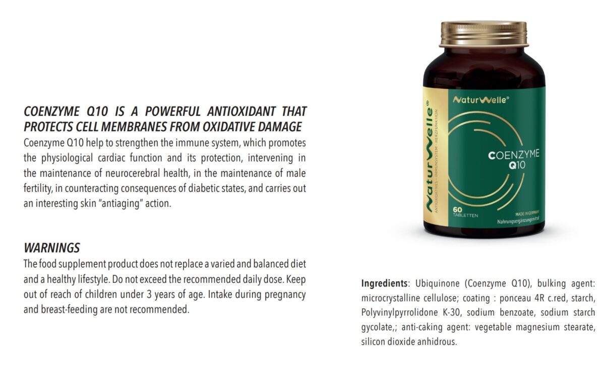 Das Coenzym Q10 trägt zur Stärkung des Immunsystems bei, fördert die physiologische Herzfunktion und deren Schutz, wirkt bei der Erhaltung der neurozerebralen Gesundheit, bei der Erhaltung der männlichen Fruchtbarkeit, bei der Bekämpfung der Folgen von Diabetes und hat eine interessante „Anti-Aging“-Wirkung auf die Haut.