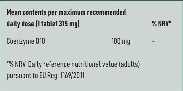 Ubichinon (Coenzym Q10), Füllstoff: mikrokristalline Cellulose; Beschichtung : ponceau 4R c.rot, Stärke, Polyvinylpyrrolidon K-30, Natriumbenzoat, Natriumstärke glykolat,; Trennmittel: pflanzliches Magnesiumstearat, siliziumdioxid anhidrous.