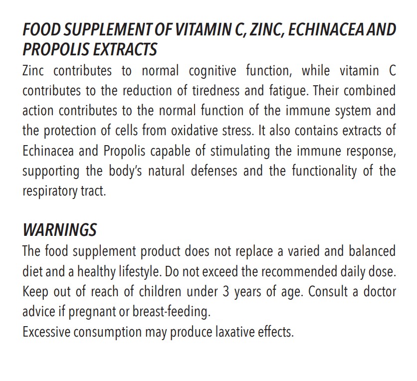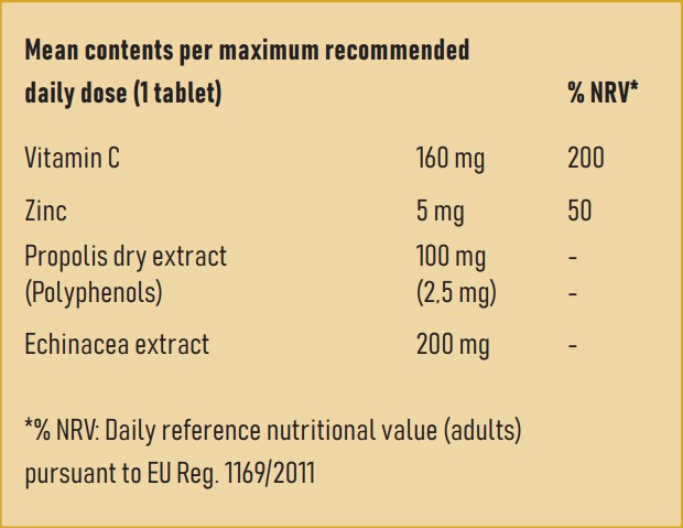 Acidity regulators: citric acid, sodium carbonates; firming agent: sorbitols; echinacea aerial parts extract (Echinacea purpurea); L-ascorbic acid (vitamin C); propolis dry extract titr. 2,5% polyphenols; sweeteners: cyclamates, saccharins; flavourings; firming agent: polyethylene glycol; zinc sulphate; anti-caking agent: silicon dioxide; colour: riboflavins.