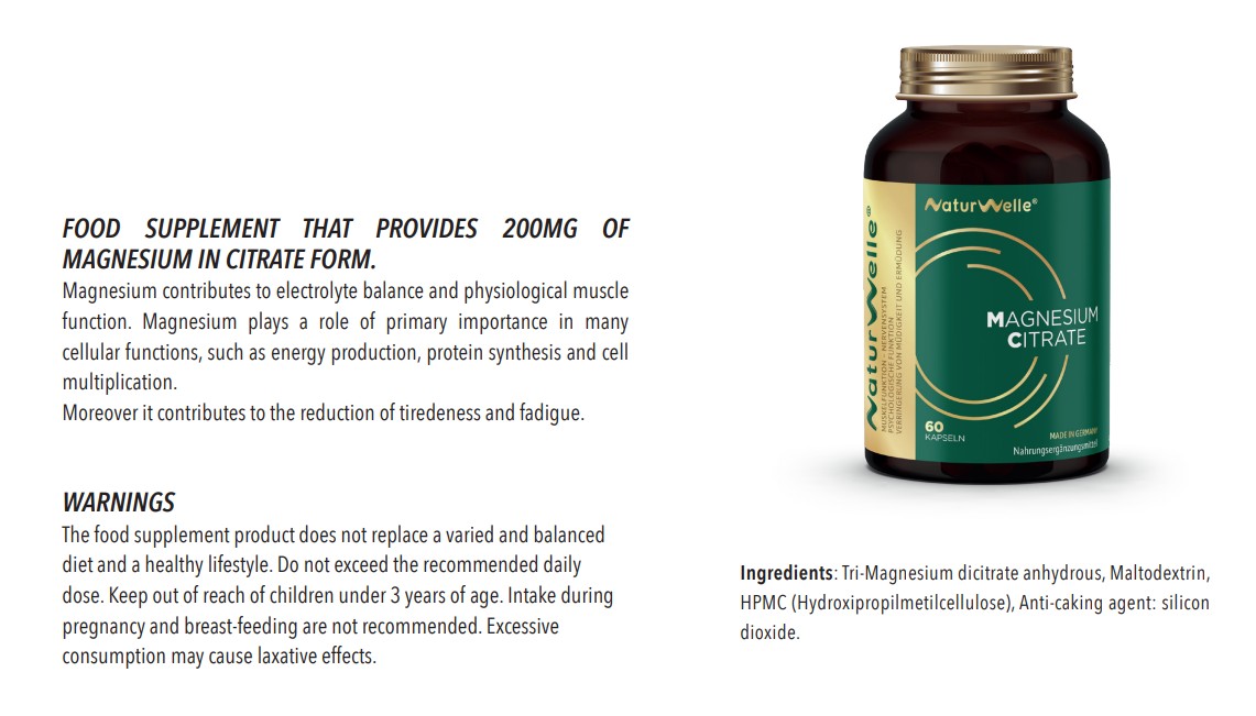 Nahrungsergänzungsmittel, das 200 mg magnesium in citratform enthält.