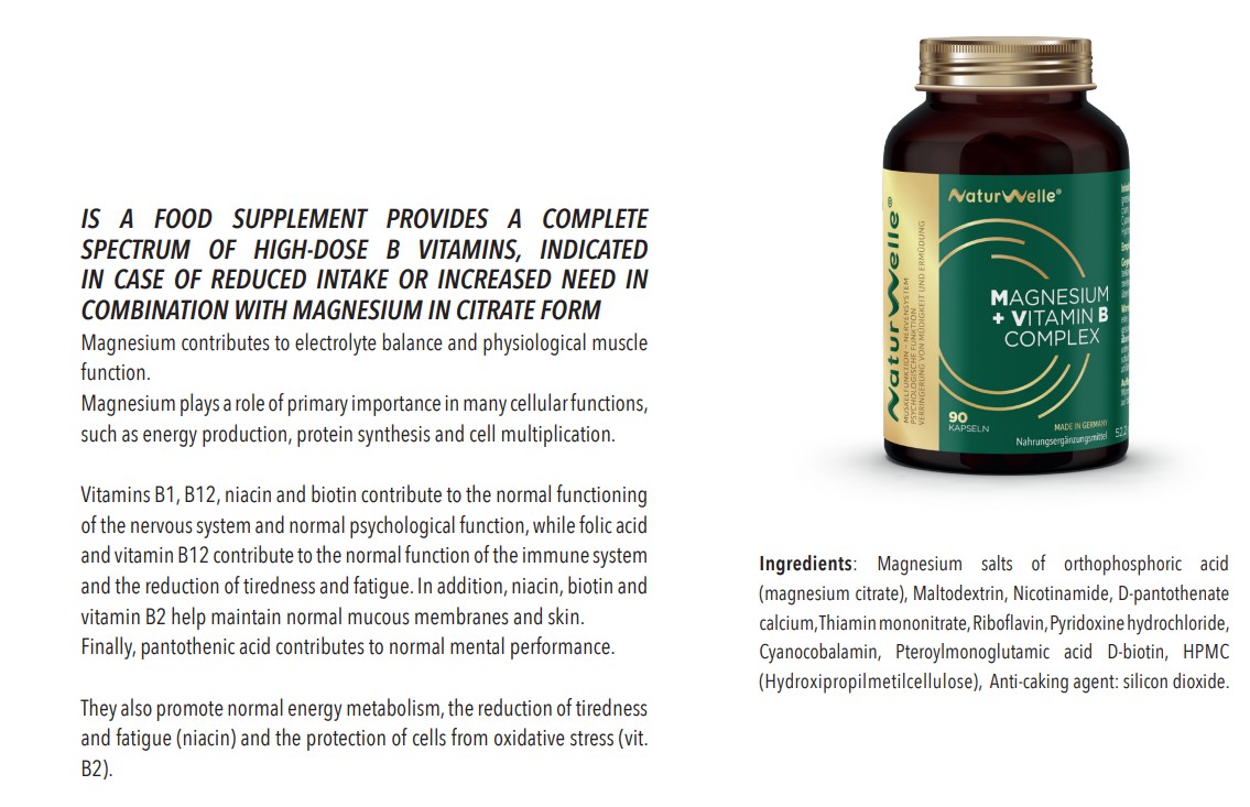 Ist ein nahrungsergänzungsmittel, das ein komplettes spektrum an hochdosierten b-vitaminen liefert, angezeigt bei verminderter zufuhr oder erhöhtem bedarf in kombination mit magnesium in citratform
