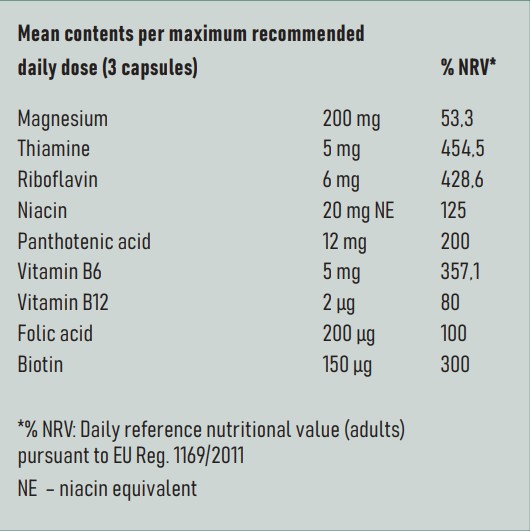 Die Vitamine B1, B12, Niacin und Biotin tragen zu einer normalen Funktion des Nervensystems und einer normalen psychischen Funktion bei, während Folsäure und Vitamin B12 zu einer normalen Funktion des Immunsystems und zur Verringerung von Müdigkeit und Erschöpfung beitragen. Darüber hinaus tragen Niacin, Biotin und Vitamin B2 zur Erhaltung normaler Schleimhäute und Haut bei.