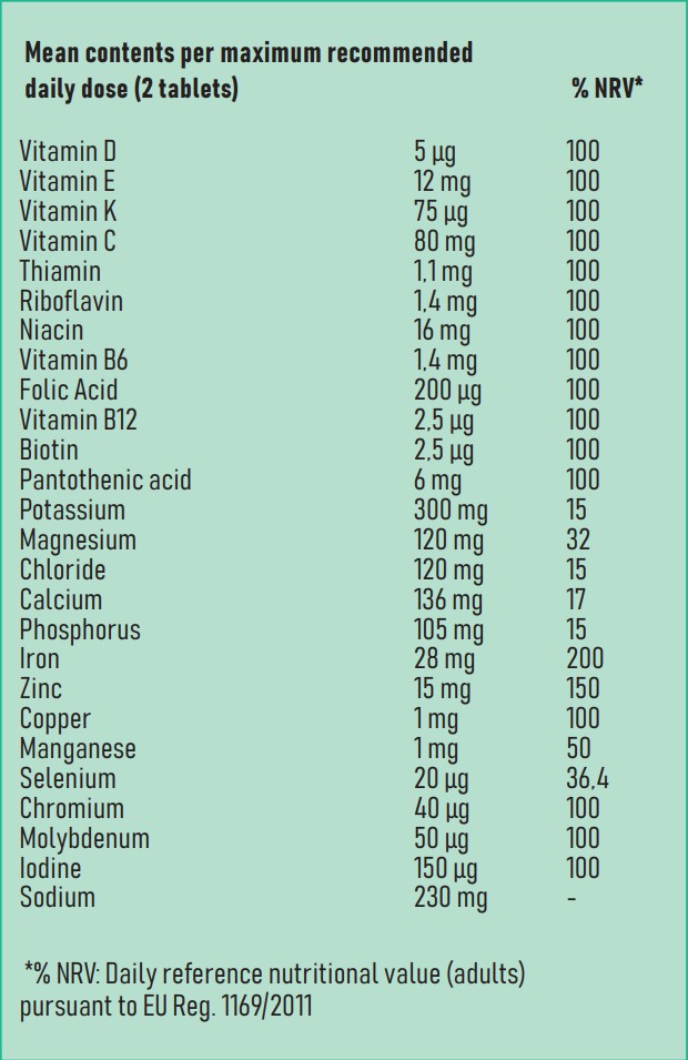 Säureregulator: Zitronensäure; Festigungsmittel: sorbitole; Natriumbicarbonat; Calciumsalze der Orthophosphorsäure säure; kaliumbicarbonat; magnesiumcarbonat; Kalium chlorid; L-Ascorbinsäure (Vitamin C); Süßungsmittel: Cyclamate, saccharine; Rote-Bete-Konzentrat; Aromen; Eisen sulfat; Magnesiumoxid; Festigungsmittel: Polyethylen glykol; DL-alpha-tocopherylacetat (Vitamin E); Beta-Carotin (vitamin A); Chrom (III) -chlorid; Trennmittel: Silizium dioxid; Zinkoxid; Nicotinamid (Niacin); D-Pantothenat, calcium (Pantothensäure); Retinylacetat (Vitamin A); D-Biotin (Biotin); Pteroylmonoglutaminsäure (Folsäure); kupfersulfat; Cyanocobalamin (Vitamin B12); Mangan sulfat; Cholecalciferol (Vitamin D); Pyridoxinhydrochlorid (Vitamin B6); Natriumselenat; Riboflavin (Vitamin B2); Thiamin mononitrat (Thiamin); Phyllochinon (Vitamin K); Kalium jodat; Natriummolybdat.
