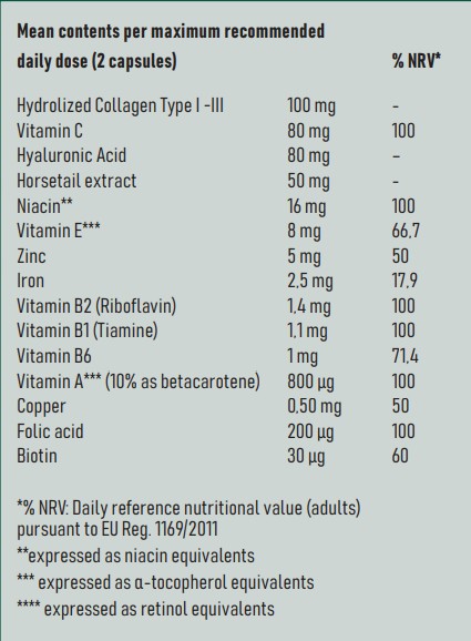 Die spezielle Formulierung ist mit Pflanzenextrakten, Vitaminen und Mineralien angereichert, die in der Lage sind, die allmähliche Aufnahme und Verstoffwechselung von Nährstoffen zu fördern, die Funktion der Kollagensynthese in den Gewebszellen zu stimulieren und die Gesundheit der Gelenke und der Haut zu unterstützen.
