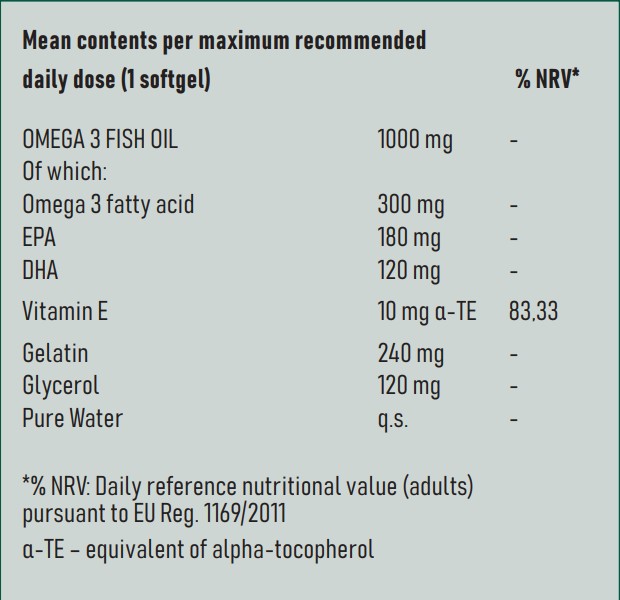 Omega-3-Fischöl mit 18% EPA (Eicosapentaensäure säure) und 12% DHA (docosahexaensäure), Antioxidans: Vitamin E (DL-alfa-Tocopherylacetat) Geliermittel: essbar gelatine, Feuchthaltemittel: Glycerin E422, Wasser