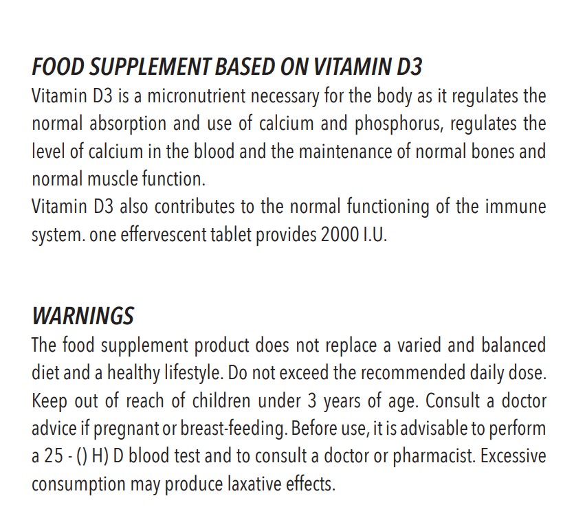 Vitamin D3 ist ein für den Körper notwendiges Mikronährstoff, da es die normale Aufnahme und Verwertung von Kalzium und Phosphor reguliert, den Kalziumspiegel im Blut aufrechterhält und zur Erhaltung normaler Knochen sowie zu einer normalen Muskelfunktion beiträgt.
