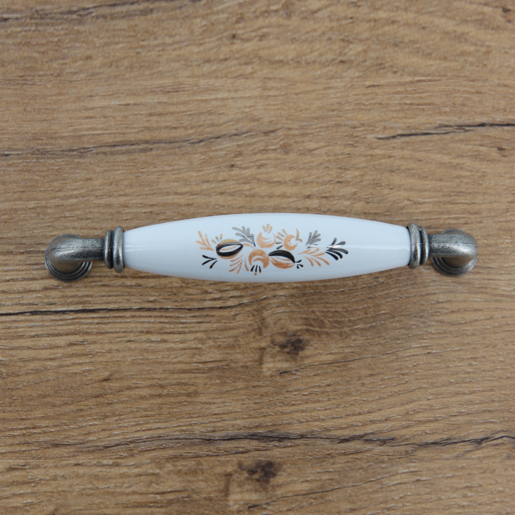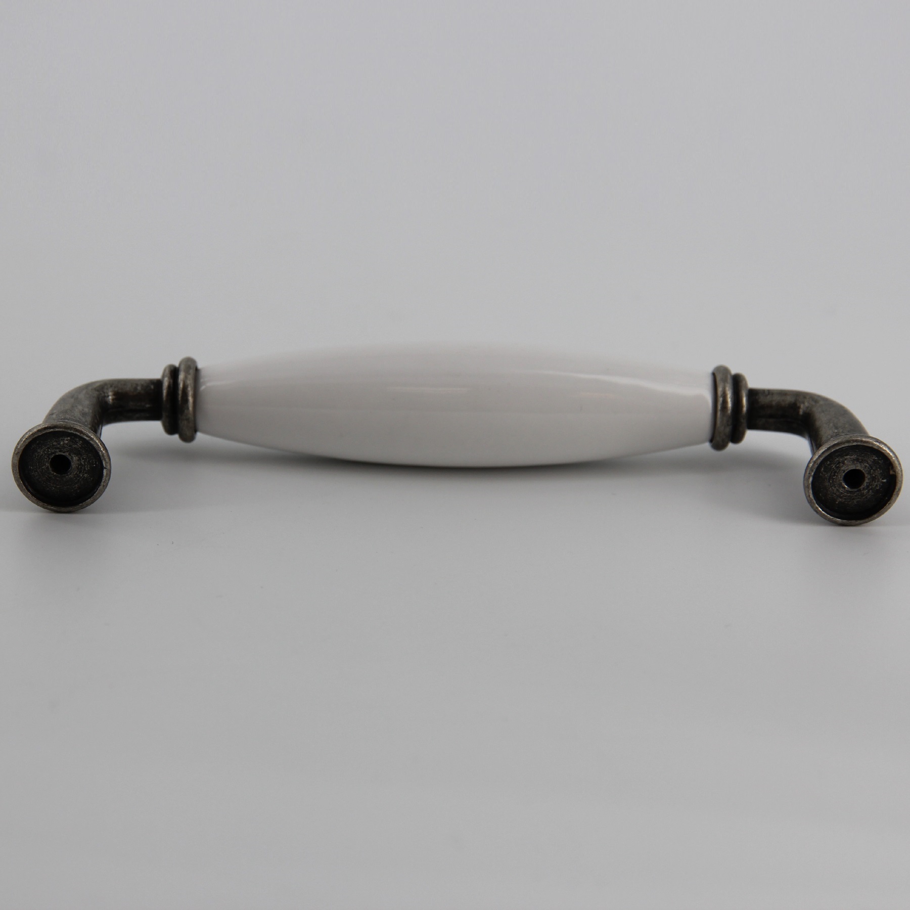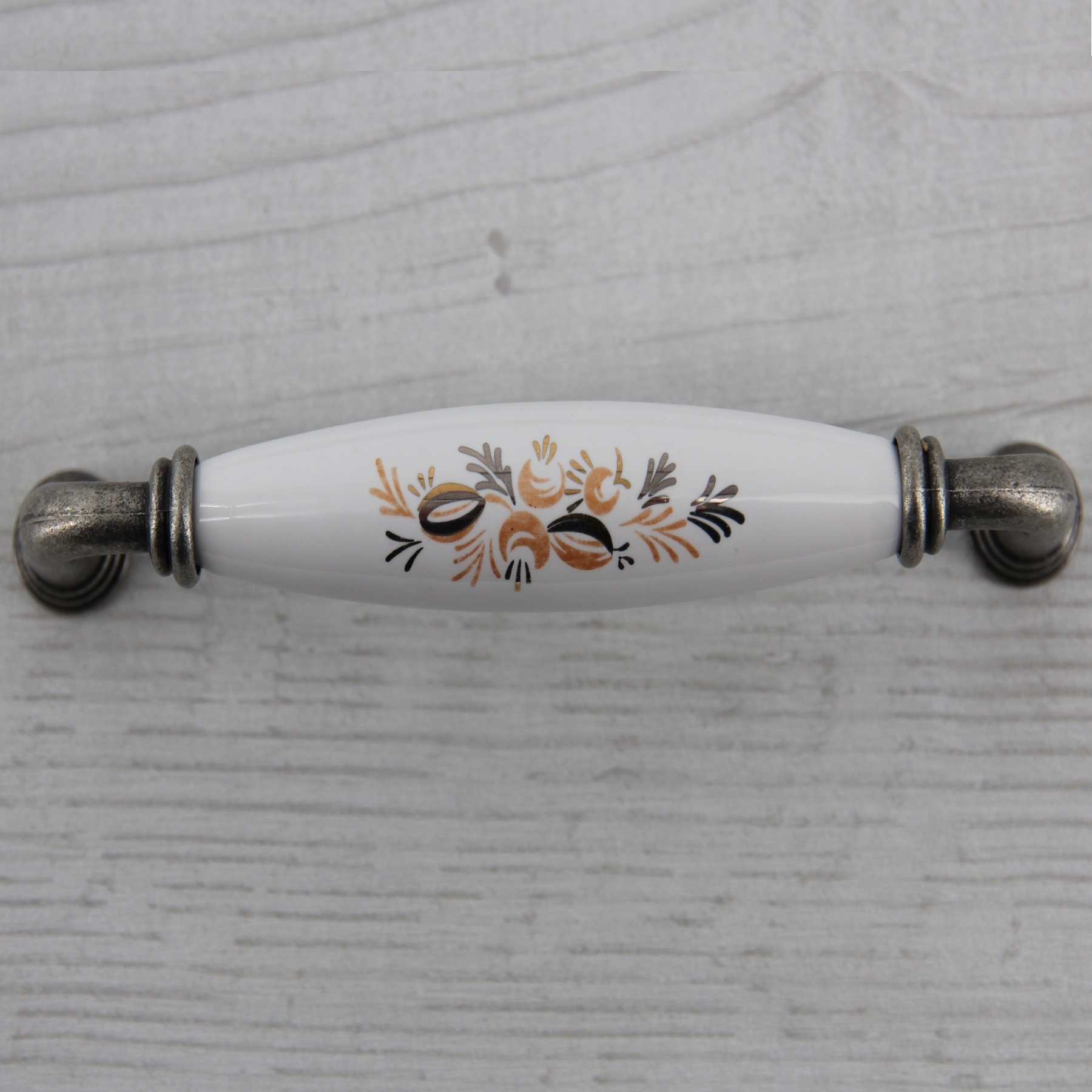 Exklusiver Möbelgriff (Küchengriff, Schrankgriff, Kommodengriff) „Ast braun-grau“ von STELO aus hochwertigem weißem Porzellan (echtes Porzellan, keine Keramik!) und Zamak in Antikgrau-Look. Das Produkt wird in einer Porzellanmanufaktur handgefertigt!