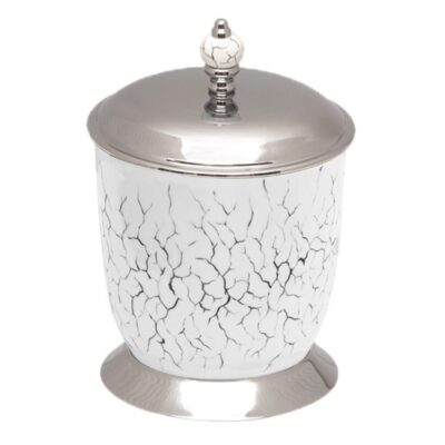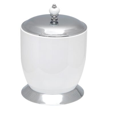 Exklusiver WC-Mülleimer (Abfalleimer, Kosmetikeimer) mit Deckel aus hochwertigen Materialien – verchromtem Messing und weißem handbemaltem Qualitätsporzellan (keine Keramik!) – sieht edel aus und wertet jedes Bad oder Gäste-WC auf. Der handbemalte Mülleimer in Premium-Qualität zeichnet sich durch elegantes klassisches Design, hohe Stabilität des Materials, Langlebigkeit und makellose Oberfläche aus. Seine verchromte Oberfläche verliert auch nach Jahren seinen Glanz nicht.
