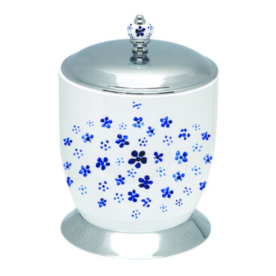 Exklusiver WC-Mülleimer (Kosmetikeimer, Abfalleimer) mit Deckel von STELO aus hochwertigem verchromtem Messing und weißem handbemaltem Porzellan (echtes Porzellan, keine Keramik!). Meisterhafte Handwerkkunst. Exklusives Maritim-Design (Dekor 100). Das Produkt wird in Handarbeit in einer Porzellanmanufaktur hergestellt und montiert!